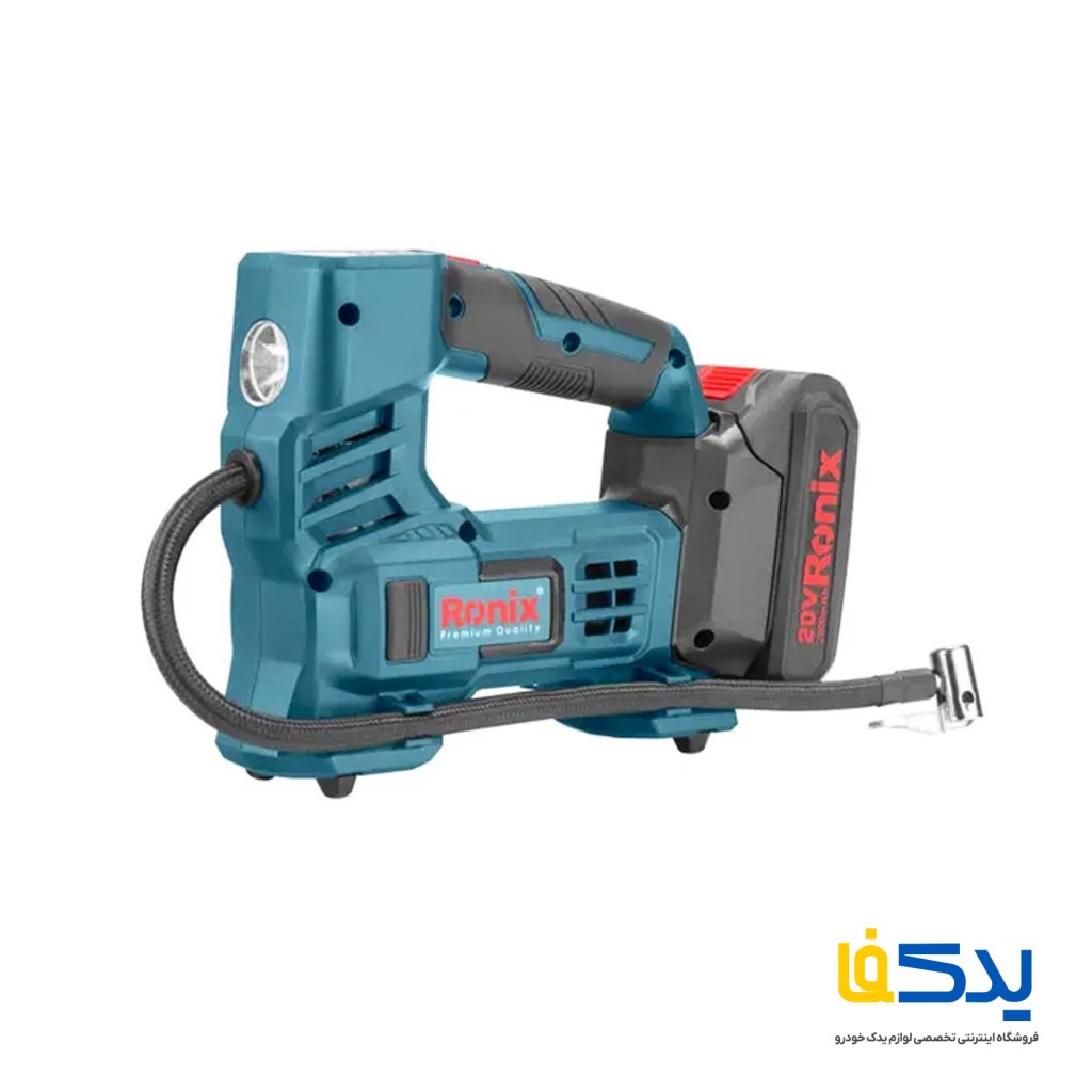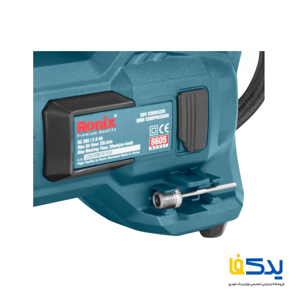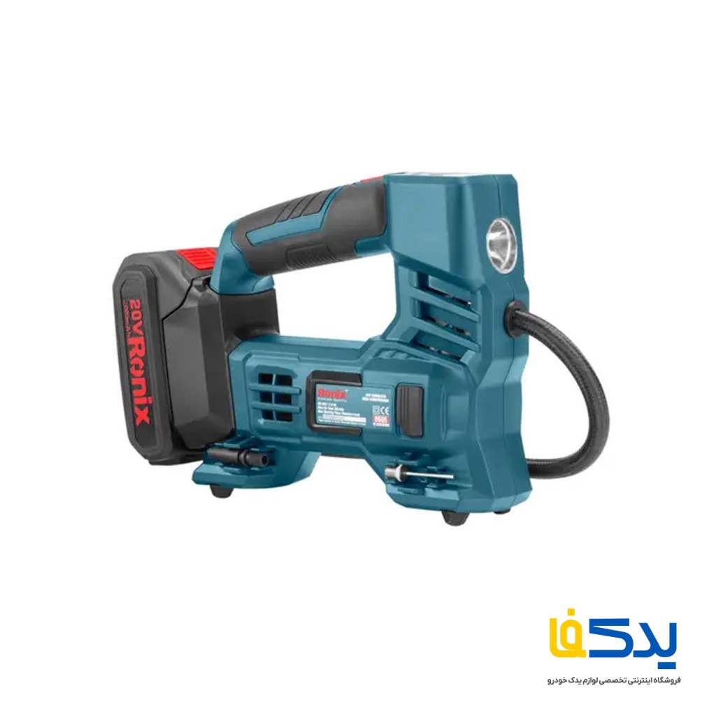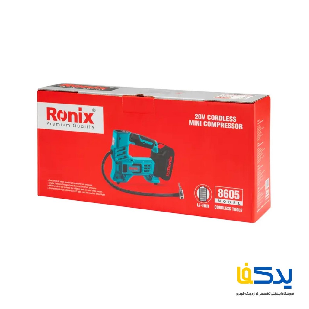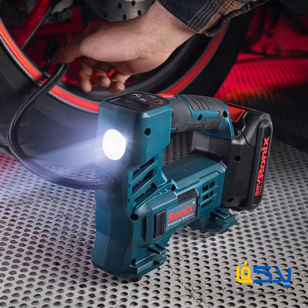 مینی کمپرسور شارژی رونیکس مدل 8605 دستگاهی قابل حمل و مناسب برای باد کردن لاستیک خودرو، دوچرخه و وسایل ورزشی است. این دستگاه با باتری 20 ولتی کار می کند و امکان تنظیم فشار باد تا 150 PSI را دارد. صفحه نمایش دیجیتال و خاموشی خودکار از مزایای مهم آن هستند. طراحی سبک، چراغ LED و سه نازل جانبی، کاربری را در شرایط مختلف آسان کرده اند. مناسب استفاده شخصی و در سفرهای جاده ای است.