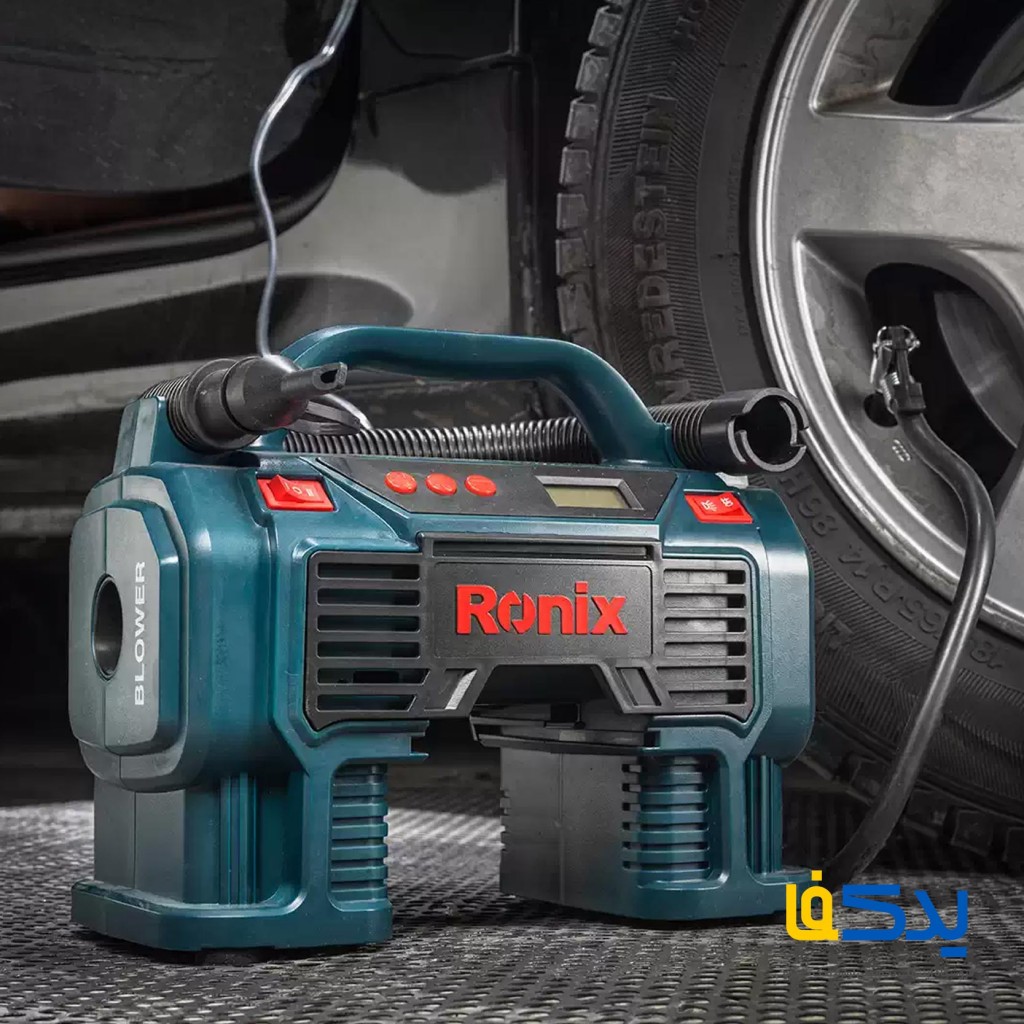 مینی کمپرسور باد فندکی رونیکس مدل RH-4260B دستگاهی کوچک و کاربردی است که بهطور ویژه برای باد کردن تایر خودرو، موتورسیکلت، دوچرخه و وسایل بادی طراحی شده است. این مدل با استفاده از برق ۱۲ ولت از طریق فندک خودرو کار می کند و قابلیت حمل آسان دارد. نمایشگر دیجیتال روی دستگاه فشار باد را دقیق نمایش می دهد و وقتی فشار به حد مطلوب رسید، دستگاه به صورت خودکار خاموش می شود تا از آسیب به تایر جلوگیری شود. همچنین مجهز به چراغ LED است که برای استفاده در محیطهای تاریک یا شرایط اضطراری مناسب است. همراه دستگاه چند نازل مختلف ارائه میشود که امکان باد کردن توپ، تشک بادی و سایر وسایل را فراهم می کند.