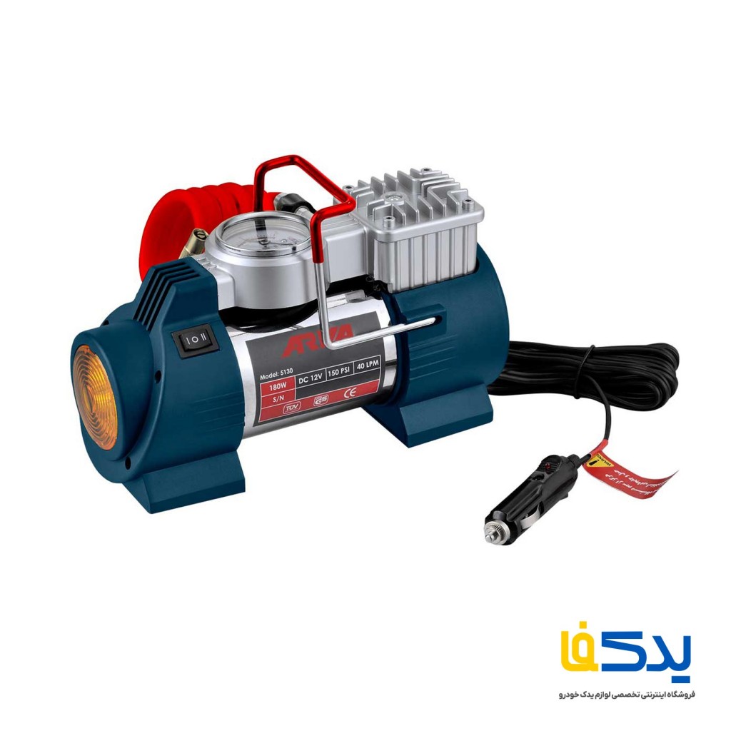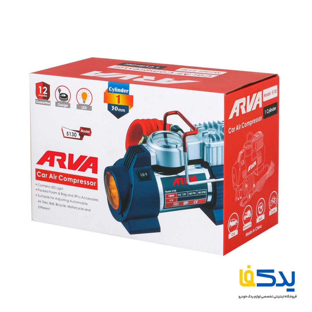 مینی کمپرسور باد فندکی آروا مدل 5130 تک سیلندر با ولتاژ 220 ولت و خروجی هوا به میزان 40 لیتر می تواند تایر خودرو را در دو الی سه دقیقه پر کند، همچنین مجهز به موتور پر قدرت با تولید هوا با فشار 150 پاسکال است.
