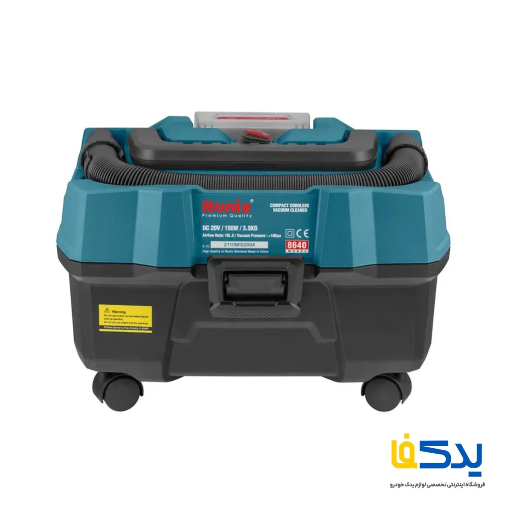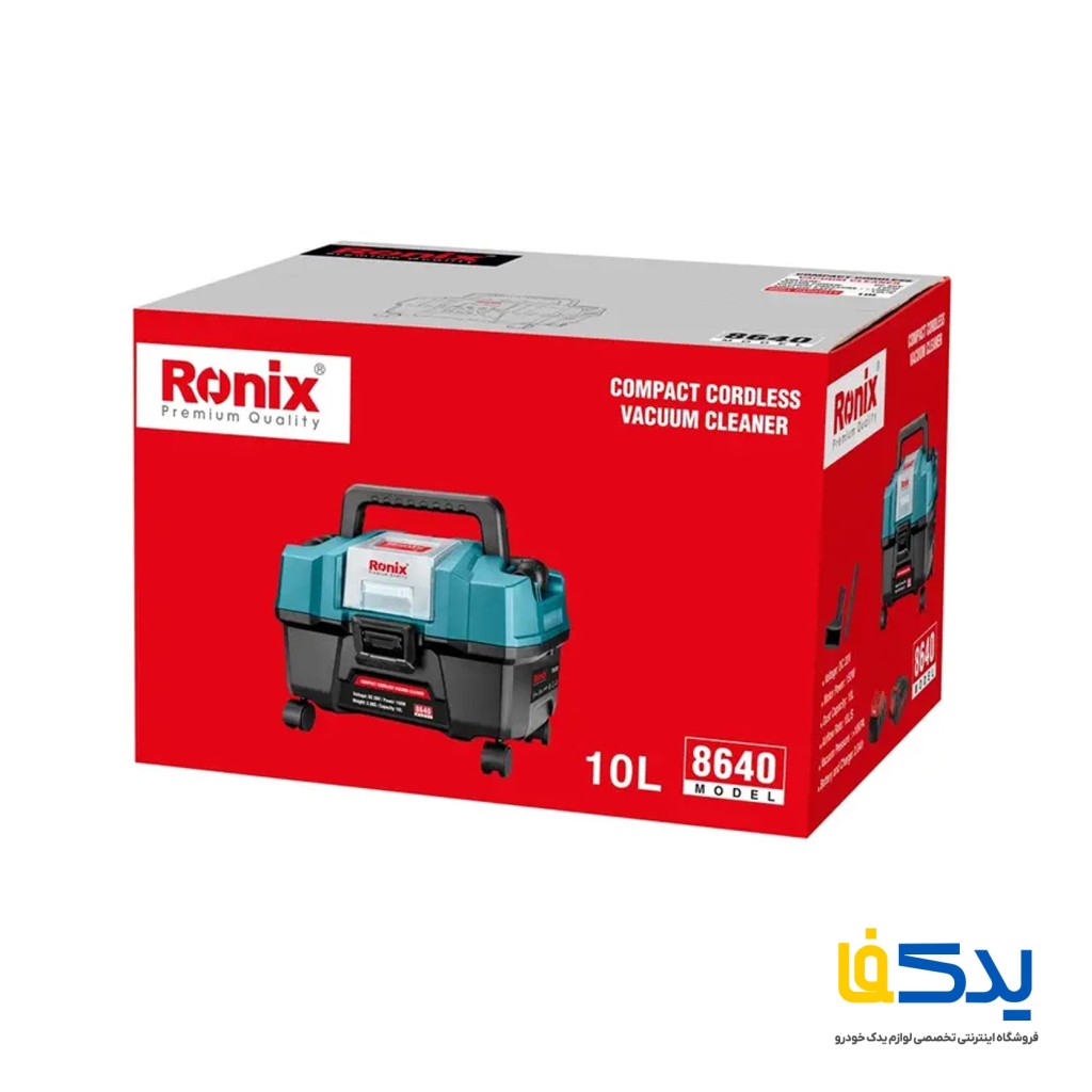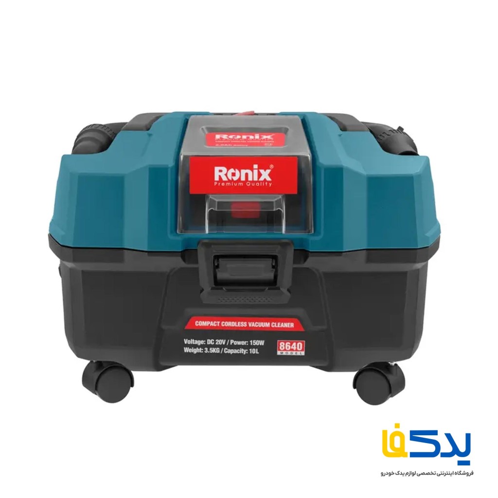 جارو شارژی 10 لیتری رونیکس مدل 8640 دارای توان 20 ولت برای جمع آوری خشک و تر، دستگاهی قابل حمل دارای چرخ برای حمل و نقل آسان، دارای قابلیت نظافت سطوح خشک و مرطوب، دارای مکش فوق العاده و همچنین دارا بودن در پوش پلاستیکی روی باتری برای جلوگیری از نفوذ آب به داخل باتری را می توان از ویژگی های مهم این جارو شارژی عنوان کرد. این جاروی پر قدرت شارژی مناسب فعالیتهای خانگی، تمیز کاری اتومبیل و… است.