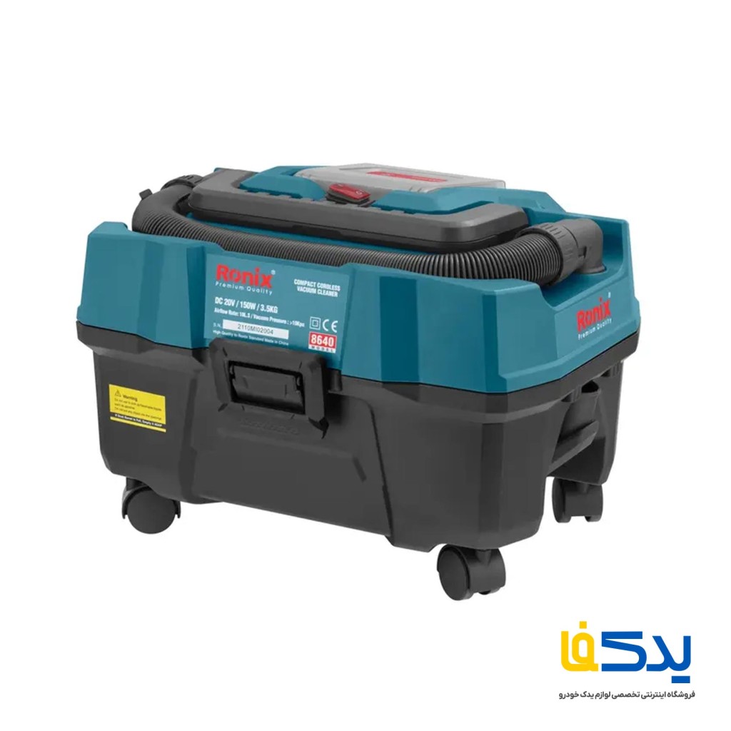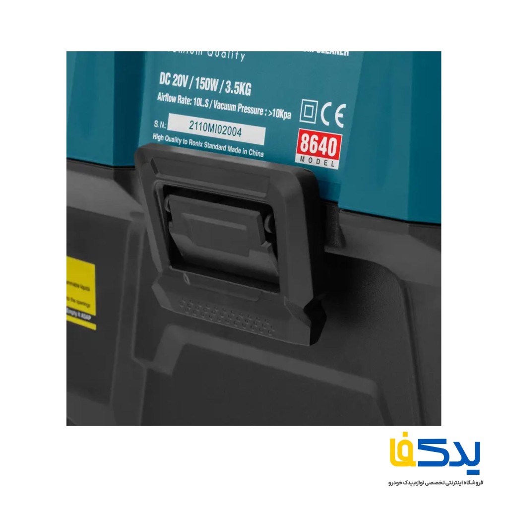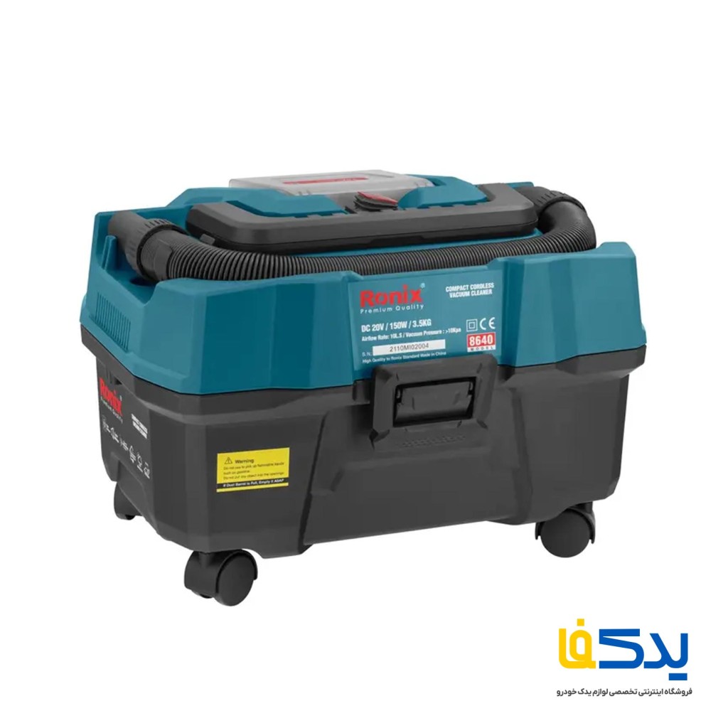 جارو شارژی 10 لیتری رونیکس مدل 8640 دارای توان 20 ولت برای جمع آوری خشک و تر، دستگاهی قابل حمل دارای چرخ برای حمل و نقل آسان، دارای قابلیت نظافت سطوح خشک و مرطوب، دارای مکش فوق العاده و همچنین دارا بودن در پوش پلاستیکی روی باتری برای جلوگیری از نفوذ آب به داخل باتری را می توان از ویژگی های مهم این جارو شارژی عنوان کرد. این جاروی پر قدرت شارژی مناسب فعالیتهای خانگی، تمیز کاری اتومبیل و… است.
