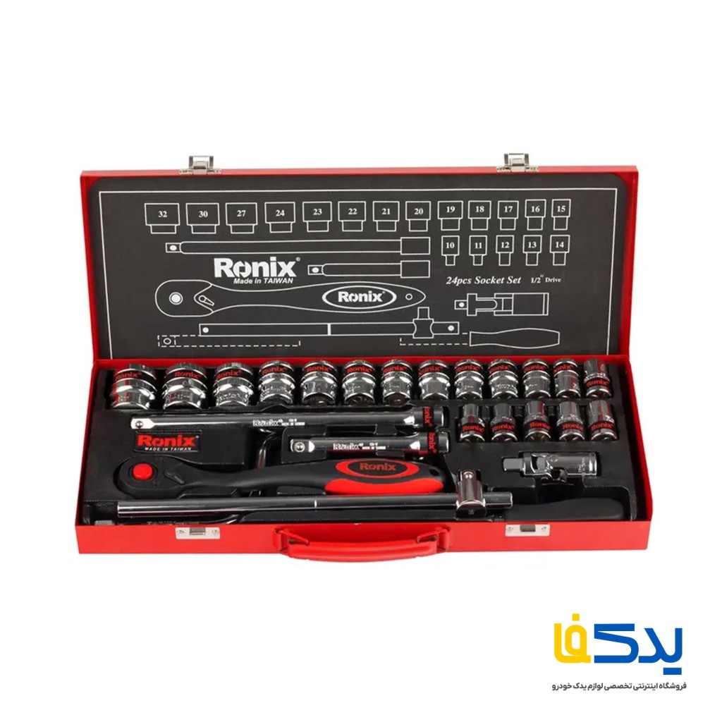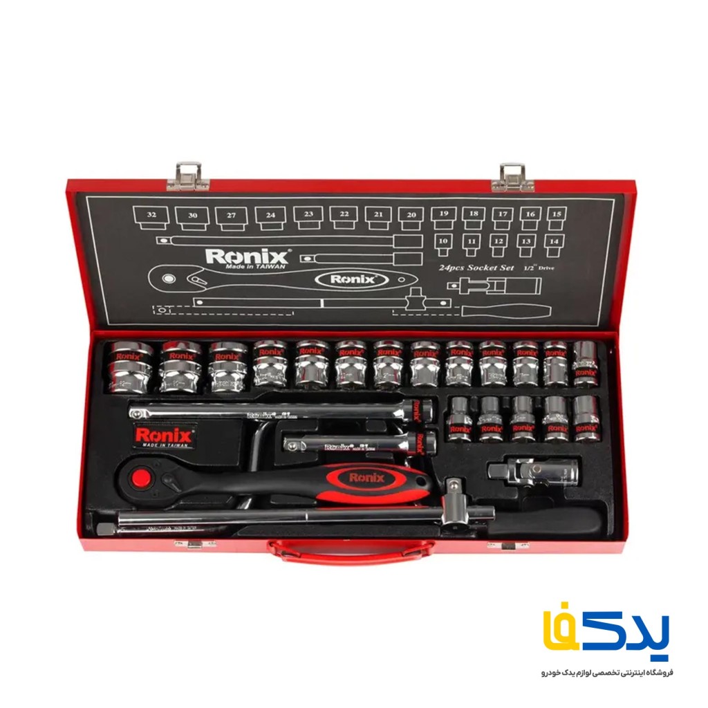 مجموعه 24 عددی آچار بکس رونیکس مدل RH-2624 دارای بدنه ای از جنس آلیاژ کروم وانادیوم و محتویاتی شامل 18 عدد سری بکس 1.4 اینچی در سایزهای: 10، 11، 12، 13، 14، 15، 16، 17، 18، 19، 20، 21، 22، 23، 24، 27، 30 و 32 میلی متری، 2 عدد دسته کمکی بلند و کوتاه در سایز های 5 و 10 اینچ، 3 عدد دسته جغحغه کشویی، کامپوزیت و هندلی در سایز 1.2 اینچ و 1 عدد لقلقه است.