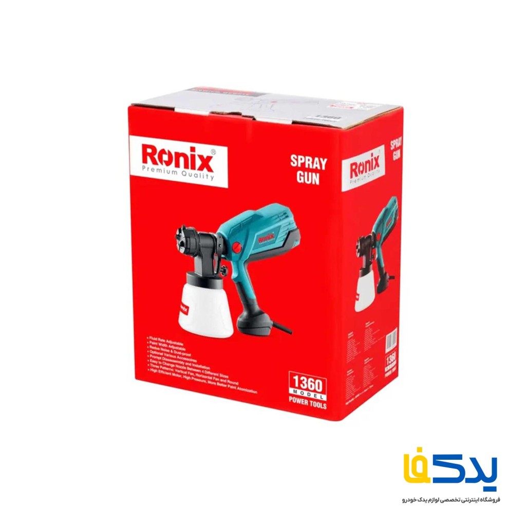 پیستوله برقی 600 وات رونیکس مدل 1360، مناسب برای انجام کارهای رنگ آمیزی هم در فضای باز و هم بسته و مجهز به نازل هایی با سایز ۱.۵ تا ۲.۲ میلی متر برای گزینه های پاشش بیشتر می باشد. این دستگاه با طراحی ارگونومیک و کاربری آسان، امکان تنظیم جهت پاشش در حالت های افقی، عمودی و گرد را فراهم می کند. همچنین قابلیت تنظیم میزان خروجی رنگ و عرض پاشش باعث کنترل کامل بر فرآیند رنگ آمیزی می شود.