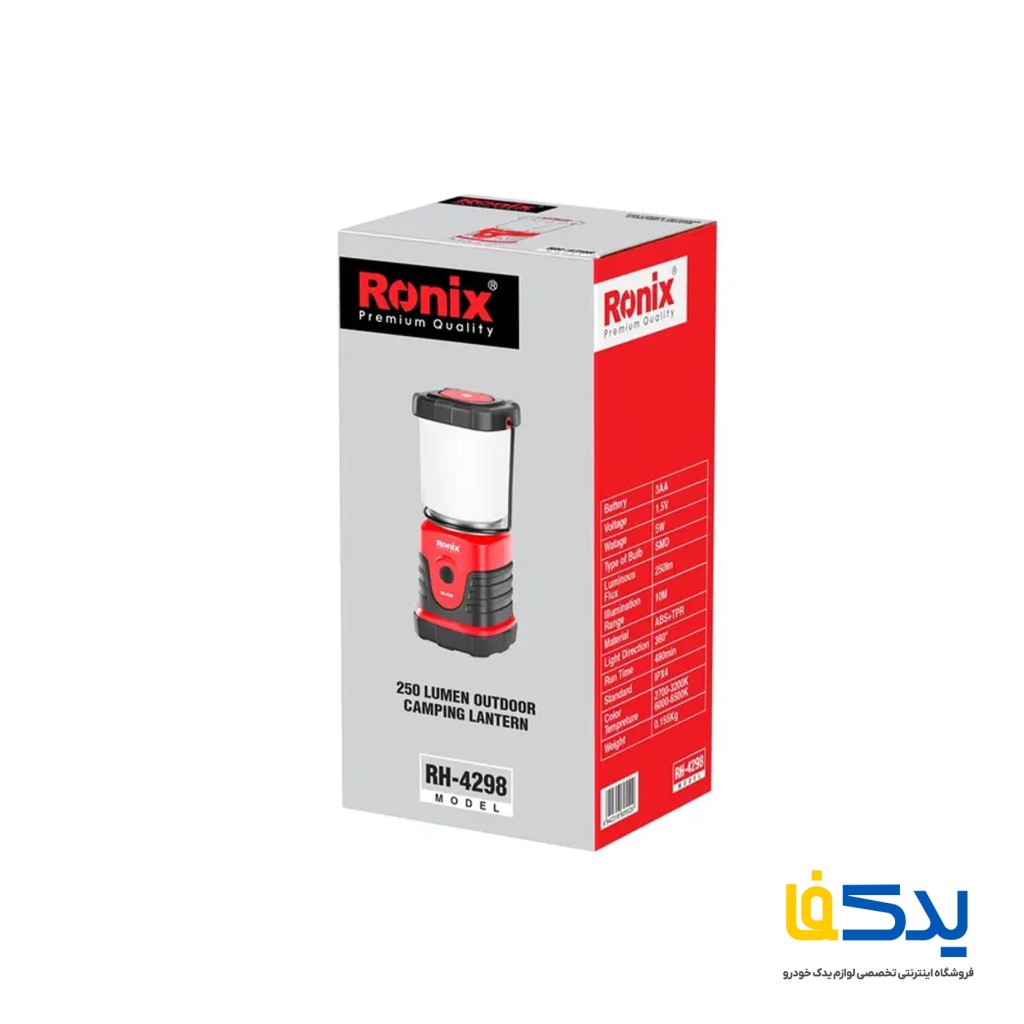 چراغ فانوسی رونیکس مدل RH-4298، با توان 5 وات طراحی شده تا با وجود مصرف کم، روشنایی مؤثری ارائه دهد. این مدل می تواند تا حداکثر 250 لومن نوردهی داشته باشد و برای فضاهای تاریک کمپ یا داخل چادر کاملاً مناسب است. وجود دو دمای رنگ، یعنی نور گرم 2700–3200 کلوین و نور سرد 6000–6500 کلوین، باعث می شود هم نور آرامش بخش داشته باشید و هم نور دقیق و شفاف. ترکیب این دو نور هم در دسترس است و با حالت چشمکزن، برای شرایط اضطراری هم کاربرد پیدا می کند.